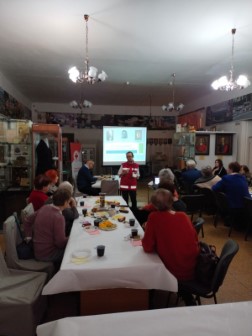 Сотрудник нашего музея В. В. ТХОРЖЕВСКАЯ провела для собравшихся экскурсию по фотовыставке «ИСТОРИЯ ДОБРА И МИЛОСЕРДИЯ», посвященной полуторавековому пути Свердловского регионального отделения РКК. Силами сотрудников местного отделения РКК в фойе была развёрнута интереснейшая выставка по истории советского Красного Креста в Первоуральске.