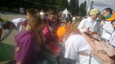12 сентября в Центральном парке культуры и отдыха им. Маяковского с 12.00 до 17.00 проходил городской спортивный праздник «Ярмарка движения», в рамках которого с 13.30 до 15.30 группа волонтеров Свердловского областного медицинского колледжа под руководством к.м.н., преподавателя педиатрии Елены Кузьминичны Серегиной развернула мобильный пункт по обучению горожан первой помощи при бытовом детском травматизме.