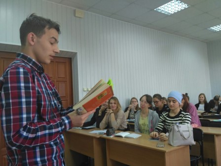 После небольшого рассказа о книгах, написанных о С.А.Есенине, студенты  читали его стихи. В число самых любимых вошли « Руки милой-пара лебедей», «Я родимый покинул дом…» « Письмо к женщине», «В том краю, где желтая крапива…», « Не бродить, не мять в кустах багряных…», «Черный человек»